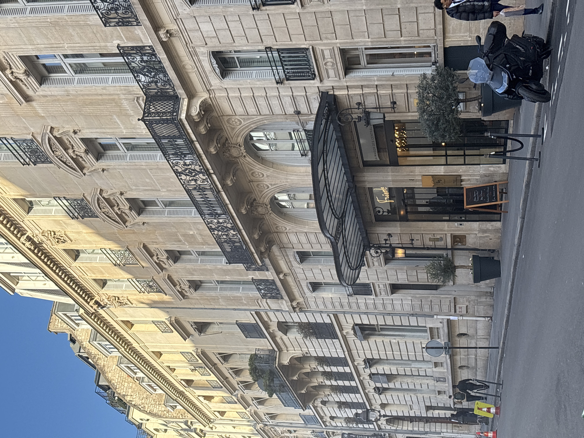 street scene in Paris, France, featuring a grand, ornate building with classical architectural details such as balconies, arched windows, and decorative stonework. The building appears to house a restaurant or business establishment, evidenced by the awning above the entrance and a menu board displayed on the sidewalk. A motorcycle is parked nearby. Pedestrians are walking on the sidewalk in the background. The sky is clear and blue.