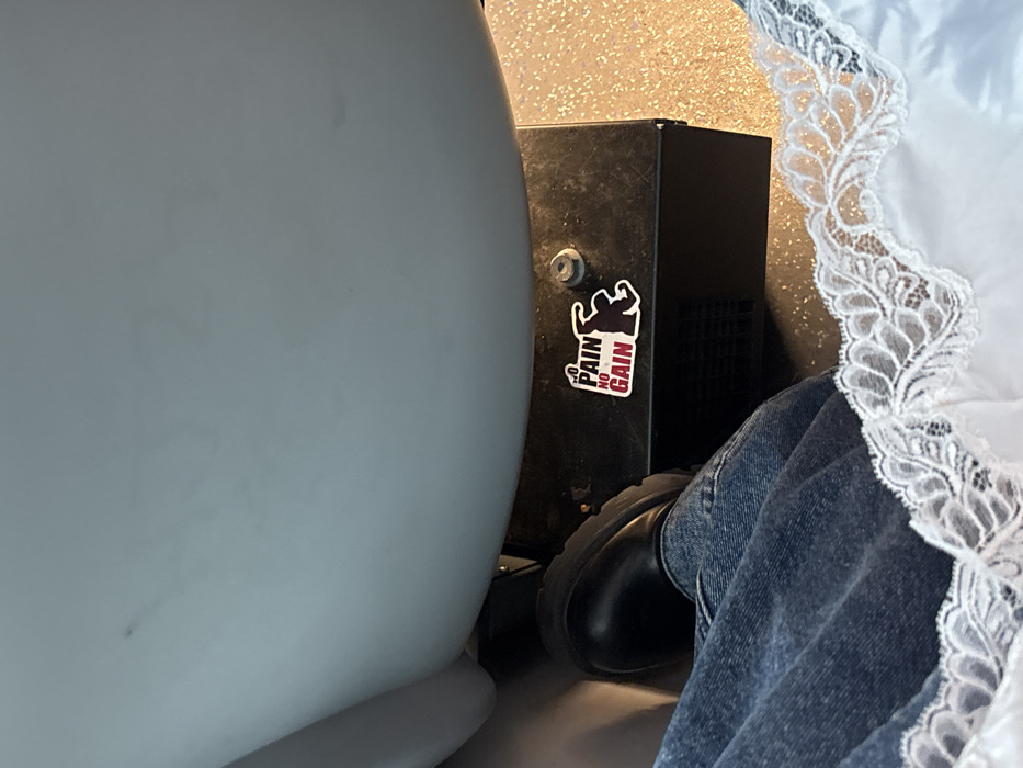 The image presents a downward-facing view of a seated individual within an indoor environment in Rueil-Malmaison, France. The lower portion of a left leg is visible, clad in blue denim jeans and a black, chunky-soled boot. To the right, the edge of a white garment with a wide, ornate white lace trim is apparent. Directly in front of the individual, a rectangular black utility box or base is situated on a light-colored floor, exhibiting warm, artificial lighting from the right. A white-bordered sticker is affixed to the top surface of this black box, displaying red text "NO PAIN NO GAIN" and a black silhouette of a muscular figure flexing. Above the black box, a large, curved, light grey structural element occupies the upper frame.