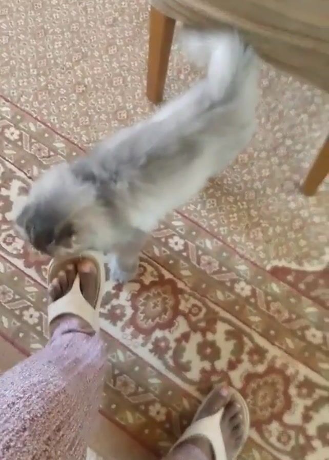 A person is wearing beige sandals and mauve pants standing on a beige carpet with a brown and red pattern. A long-haired, gray cat walks around the person's feet and rubs against their legs. A wooden chair is partially visible in the background.