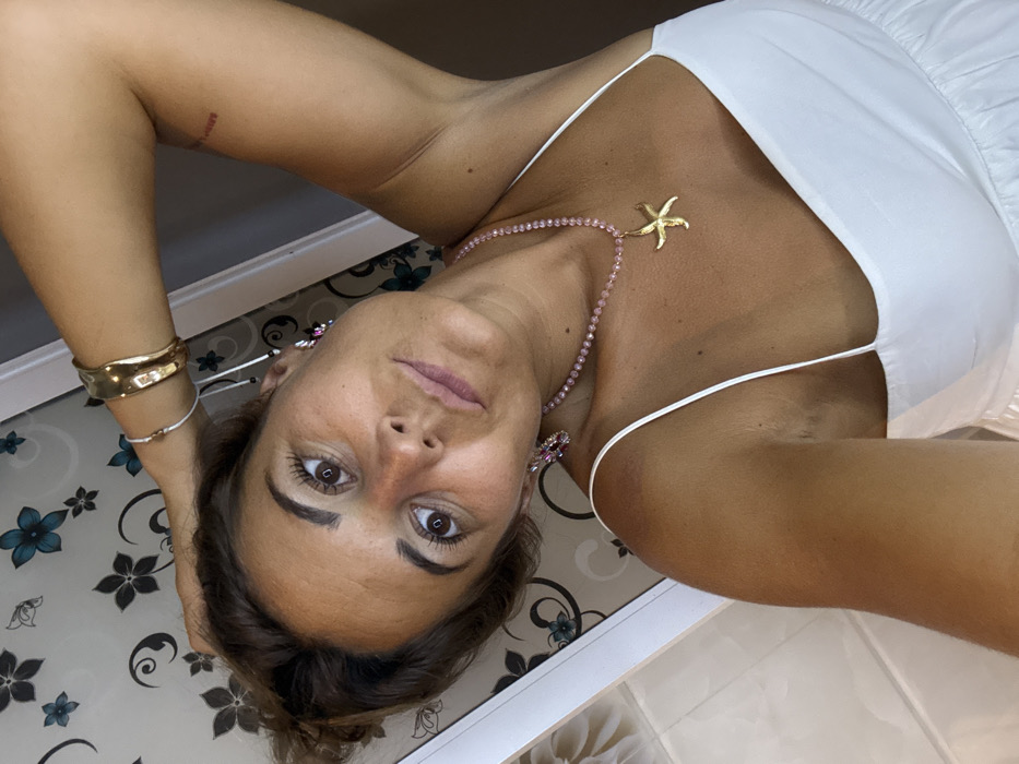 A woman poses in a white dress with spaghetti straps. She wears a pink beaded necklace with a gold starfish pendant, floral earrings with pink stones, and gold and silver bracelets on her left wrist. She looks into the camera with her head tilted to the side. The background features a floral wallpaper pattern and a white surface.