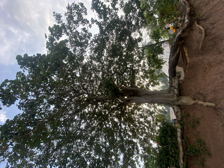 A large, leafy tree dominates the frame, viewed from a low angle looking up. The tree's trunk grows horizontally from a reddish-brown, earthen bank. Its roots are partially exposed. Dense foliage fills the upper portion of the image, partially obscuring the sky and sun, creating dappled light. Some structures are visible in the background, including a white tent or tarp-covered building. Additional greenery is visible near the base of the tree.