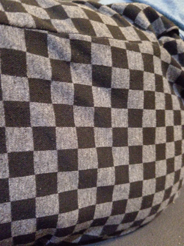 The image displays a close-up, high-angle view of a textile surface featuring a black and gray checkerboard pattern