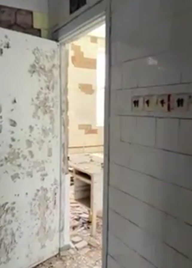 The camera looks from a hallway through a door into a dilapidated room, likely an operating room
