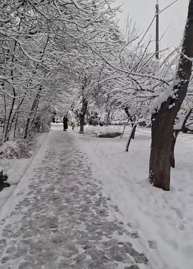 A snow-covered park path is shown from a low first-person perspective on a cloudy winter day. The path is paved and covered with ice and snow, with visible footprints. On either side of the path, the ground is covered in thick snow. Trees with snow-covered branches line the path, creating a tunnel-like effect. In the distance, two figures walk along the path, one in dark clothing and a smaller one in a yellow outfit. To the right of the path, bare tree trunks are visible. Further to the right, a street runs parallel to the path, and a white car drives by. A light post stands above the trees. The overall atmosphere is cold and quiet.