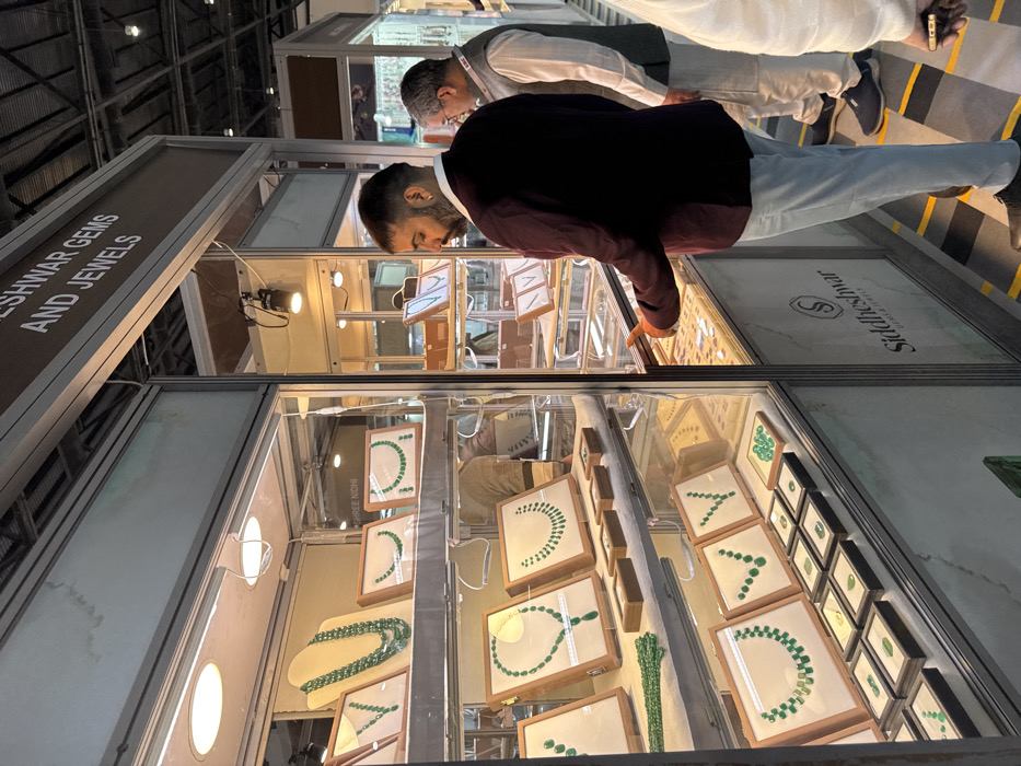 The scene depicts an indoor jewelry exhibition booth located within the Jaipur Municipal Corporation, India. The booth's overhead signage partially reads "ESHWAR GEMS AND JEWELS," while a lower display panel clearly states "SIDDHESHWAR GEMS & JEWELS." The booth features multiple vertically stacked, internally illuminated glass display cases showcasing a variety of green gemstone jewelry, predominantly emeralds. These items include numerous necklaces of varying lengths and designs, displayed on individual stands and in framed presentations, along with loose stones and smaller jewelry components arranged in trays. In the foreground, a male individual with dark hair and a beard, wearing a dark maroon blazer over a light shirt and light grey trousers, stands leaning towards the left-hand display case. His right hand is extended, pointing or indicating an item within the case. To his right and slightly behind him, a second male individual with short grey hair and spectacles, dressed in a light-colored kurta and a dark waistcoat, also observes the contents of the display cases. A third individual is partially visible on the far right, holding a light-colored smartphone. The floor is dark grey with distinct yellow and black striped safety markings. Overhead lighting fixtures and metal structural elements of the exhibition hall are visible in the background.
