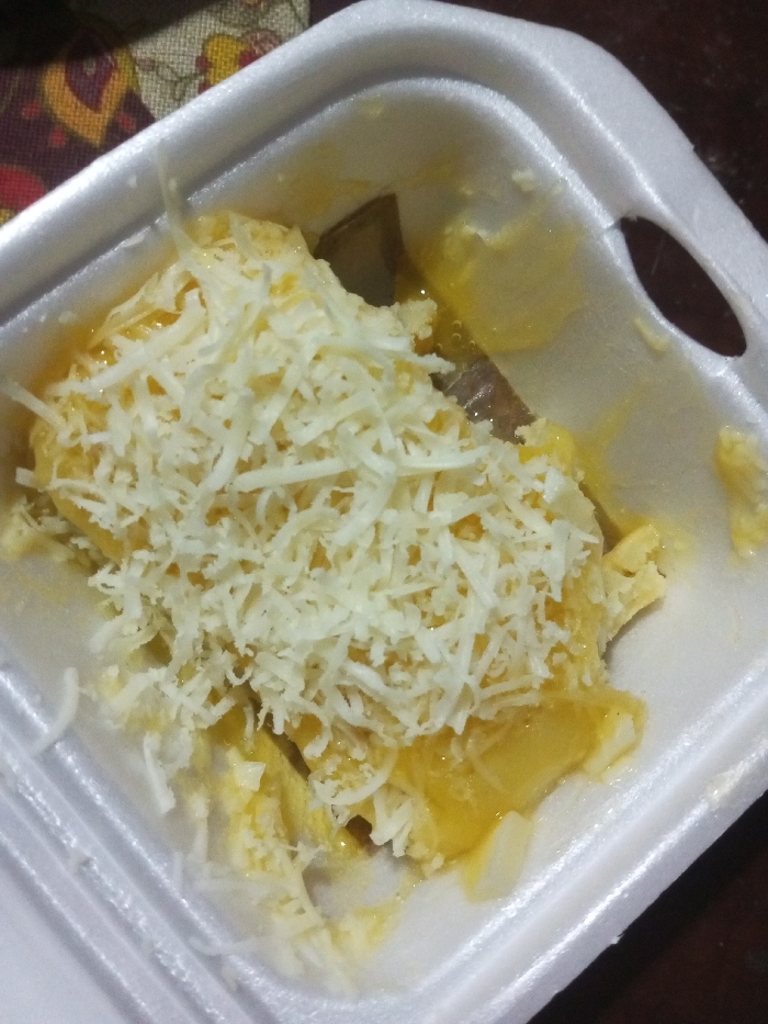The scene depicts a white styrofoam container holding a food item. The container is partially filled with a yellow, semi-liquid base, heavily topped with finely shredded white cheese. Below the yellow base, darker, irregular shapes, possibly pieces of a solid food component, are visible. The yellow substance exhibits a glossy or oily texture with small bubbles. The container features an oval-shaped indentation or void on its upper right rim. The background on the upper left shows a blurred, patterned fabric with red, yellow, and brown designs, while the remaining background is dark and indistinct. No individuals or discernible actions are present. The specified location, "Pandaria, India," is not verifiable as Pandaria is a fictional region.