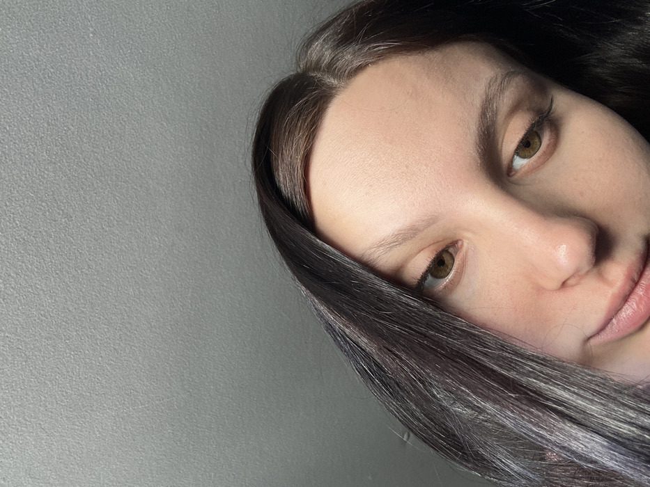 A close-up, angled portrait features the upper torso and head of an individual, presumably female, positioned in the foreground