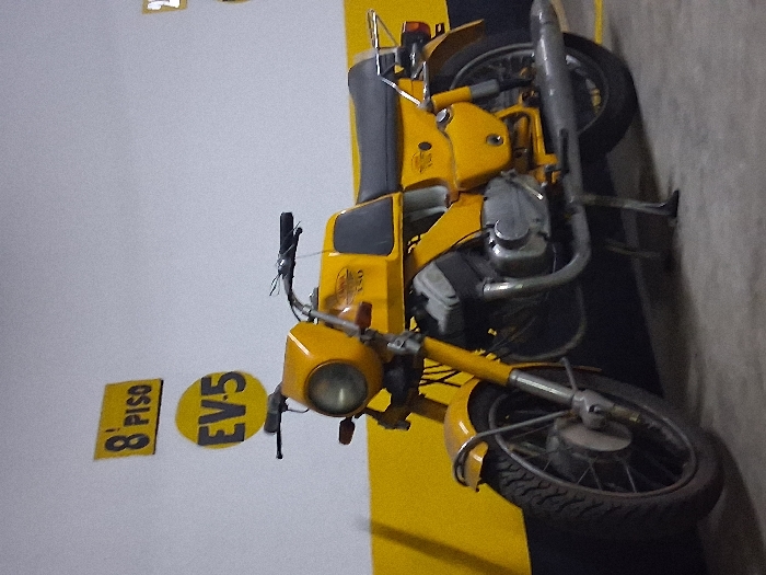 A yellow motorcycle stands next to a wall with the numbers "8 PISO" and "EV-5" displayed on it. The vehicle exhibits a classic design with a rounded headlight, visible engine components, and simple bodywork. Its tires are black, and the frame is yellow. The backdrop is a blend of white and yellow stripes, offering a bright and contrasting setting for the motorcycle. The photo is taken at an angle.