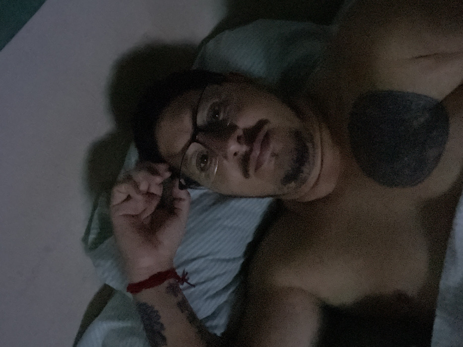 A person with glasses lies in bed with a blue and white striped pillow. The individual has a mustache and goatee. A red string bracelet is visible on their left wrist, which also has a tattoo. They also have a tattoo on their right chest. The scene is dimly lit.