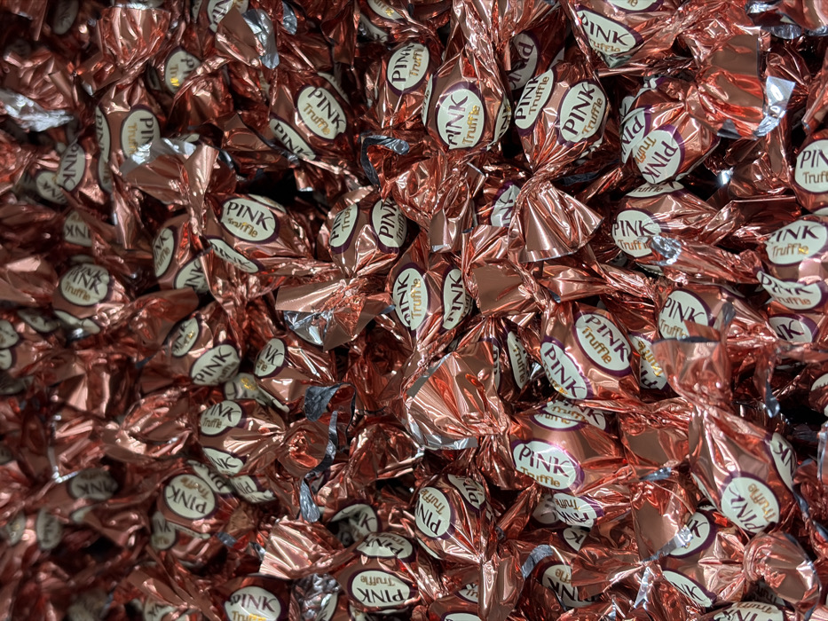 The image displays a dense, top-down view of a large quantity of individually wrapped confectionery items, specifically truffles, located in Kudrovo, Russia. Each item is enclosed in a crinkled, metallic rose-gold foil wrapper. Many wrappers feature a circular label, predominantly dark pink or maroon, with the words "PINK Truffle" printed in a contrasting white or light pink sans-serif typeface. The candies are haphazardly piled, completely filling the frame. No individuals, specific actions, or additional environmental context beyond the aggregated items are discernible.