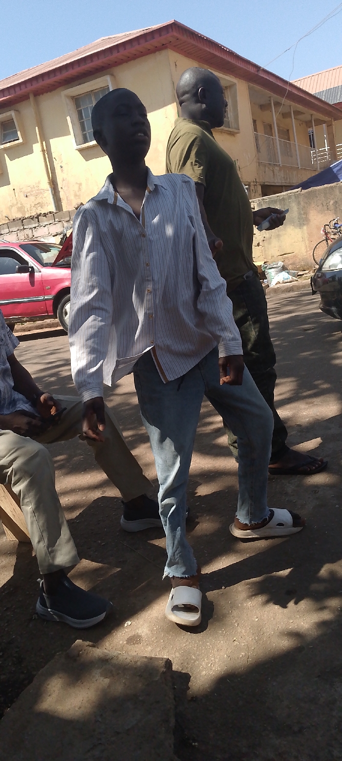 This image depicts an urban street scene in Jos, Nigeria, illuminated by direct sunlight that creates pronounced shadows. Three individuals are visible. A central figure, appearing as a young male with dark skin and short hair, stands gazing slightly upwards, clad in a light-colored vertical striped long-sleeved shirt (partially unbuttoned) and light blue jeans with frayed cuffs, wearing white slide sandals. Behind and to the right, an adult bald male with dark skin is partially visible, facing right, dressed in a dark olive-green t-shirt and dark trousers; he holds a white rectangular object in his right hand and wears dark flip-flops. To the left, the lower body of a seated individual is visible, wearing light brown trousers and dark sneakers on a wooden seat. In the background, a multi-story, light yellow building with a reddish-brown roof and multiple windows stands under a clear sky. A red sedan with its hood open is parked on the left side of the frame. On the right, the front section of a dark vehicle is partially visible, along with a bicycle leaning against a weathered brown wall. The ground consists of a rough, light-colored paved surface, scattered with dirt and loose concrete blocks. White sacks are visible against the wall on the right.