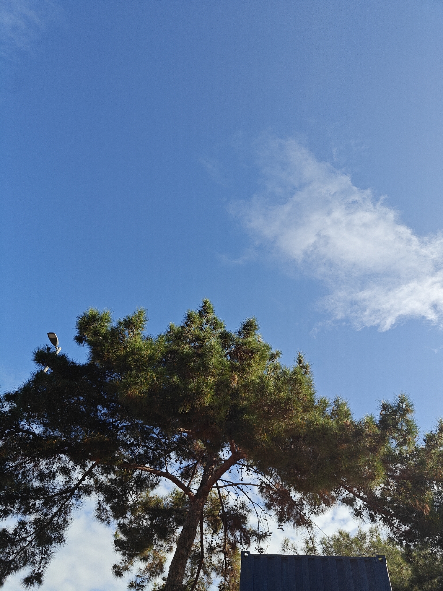 The image presents an upward view of a clear blue sky with scattered white clouds, primarily concentrated in the lower right and mid-right. A large, dark green coniferous tree, exhibiting dense needle-like foliage and visible pinecones, occupies the lower and central portions of the frame. Its branches extend broadly across the view. On the upper left, a grey street light fixture is visible, positioned above the tree canopy. In the bottom right corner, the upper section of a dark blue or grey ribbed structure, consistent with a shipping container or a large utility box, is partially discernible behind the tree. No individuals or discernible actions are present. The scene depicts an outdoor environment in Haifa, Israel, characterized by natural vegetation and urban infrastructure under daylight conditions.