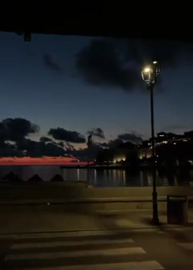 seaside view at twilight. A street with a crosswalk is in the foreground. A vintage-style street lamp is on the right side of the frame. Across the street, there's a sea wall, and beyond that, the water reflects the fading colors of the sunset. Dark clouds are scattered across the sky. On the far side of the water, there's a silhouette of a town with lights on, rising up the hill. A dark red car drives into the frame on the left and stops at the crosswalk.