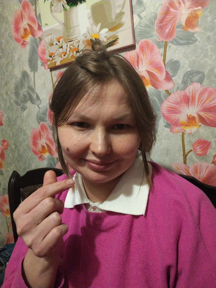 A female subject, appearing to be an adult, is depicted in a chest-up portrait shot taken indoors, identified as being in the city of Дойная, Russia. She has brown hair, partially gathered into a small bun or knot on top of her head, with strands framing her face. Her complexion is fair, with visible moles or skin tags on her left cheek. The subject wears a pink long-sleeved sweater layered over a white collared shirt, the collar of which is visible at her neck. She is smiling subtly while looking directly at the camera. Her left hand is raised, with the thumb and index finger forming a small heart gesture. The background consists of a wall covered in wallpaper featuring a pattern of large pink orchid flowers and green leaves on a light gray-green base. A framed picture, depicting a still life with a white pitcher containing white flowers and a cup, hangs on the wall behind her head. A dark wooden chair back is partially visible on the lower left side of the frame.