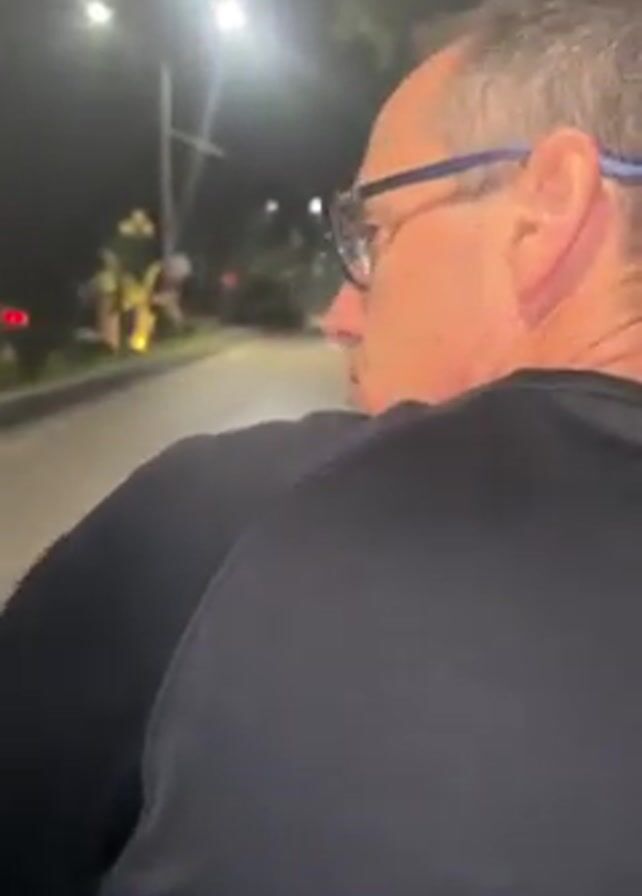 A person wearing a black shirt and glasses rides on a scooter at night. Streetlights line the side of the road. A vehicle with red lights is visible in the distance. The person turns their head briefly to look back at the camera.