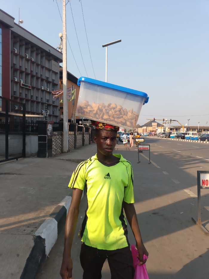 A young man balances a plastic container of food on his head, possibly for sale