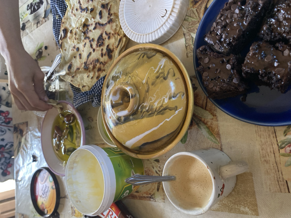 The image depicts an indoor tabletop scene in الغنادة, Tunisia, featuring a meal with multiple food items. A patterned tablecloth, beige with green and brown leaf motifs, covers the table. In the upper center, a human hand with light skin is observed dipping a piece of flatbread into a pink-rimmed white bowl containing green olives submerged in olive oil, with what appears to be almonds also present. To the right of this bowl, a stack of cooked flatbread rests on a blue and white checkered napkin. A large white plastic tub, partially full of a yellow, creamy substance, is positioned to the left of the olive bowl. A partially visible black plastic container with an open lid, revealing a light brown spread labeled "Chocoreve Crème Noisette," is situated behind the olive bowl. Centrally placed on the table is a ceramic pot with a lid, featuring yellow, white, and dark swirling patterns. To its right, an inverted white ridged plastic item is visible. In the lower left, a white ceramic mug, possibly with subtle patterns, contains a light brown beverage with foam, likely coffee, and a silver spoon. Adjacent to the mug, in the lower right, a blue plate holds several dark chocolate brownies topped with chocolate sauce and chocolate chips; one brownie exhibits evidence of consumption.