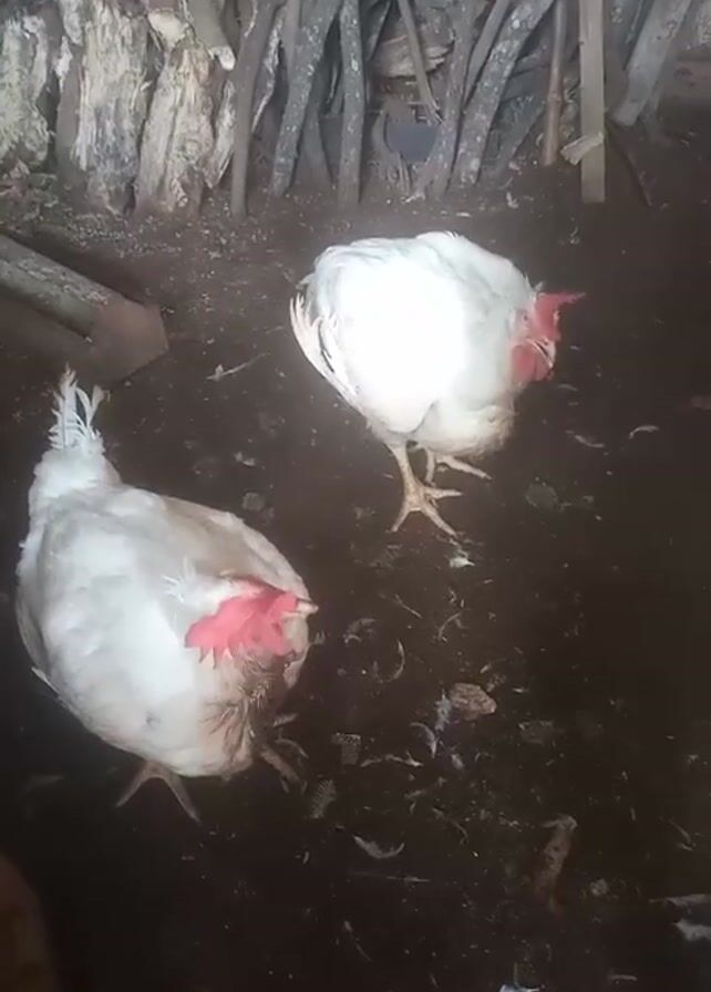 - "Two white chickens stand in a dirt enclosure with scattered feathers" by FM-76VDH2, licensed under CC BY 4.0