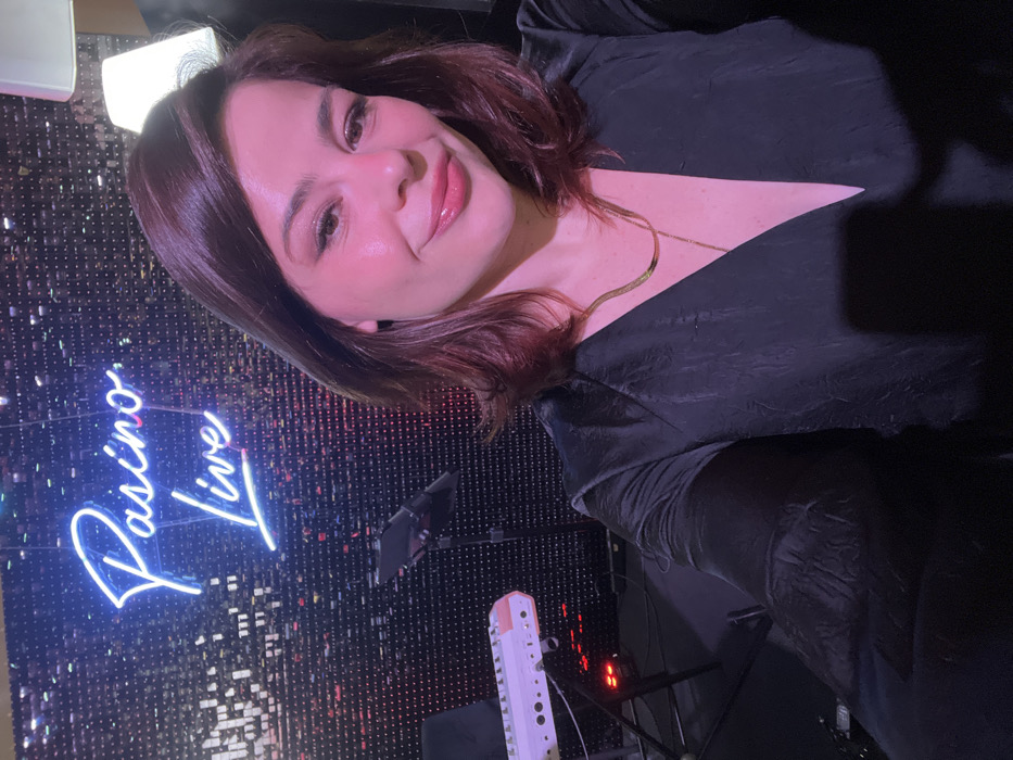 A woman smiles at the camera in a slightly rotated selfie. She wears a black dress and a thin gold necklace. Behind her is a backdrop with a glittering, patterned design. Neon signage that reads "Casino Live" is illuminated on the backdrop. A microphone and an instrument stand are also visible in the background. The lighting is a combination of bright and dim, creating soft shadows.