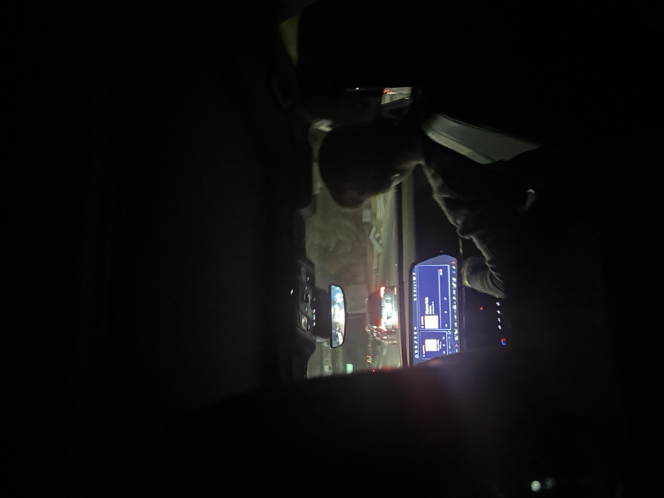 - "Inside a dimly lit car, a driver glances down at a brightly lit infotainment screen displaying a music menu" by FM-EquHJ3, licensed under CC BY 4.0