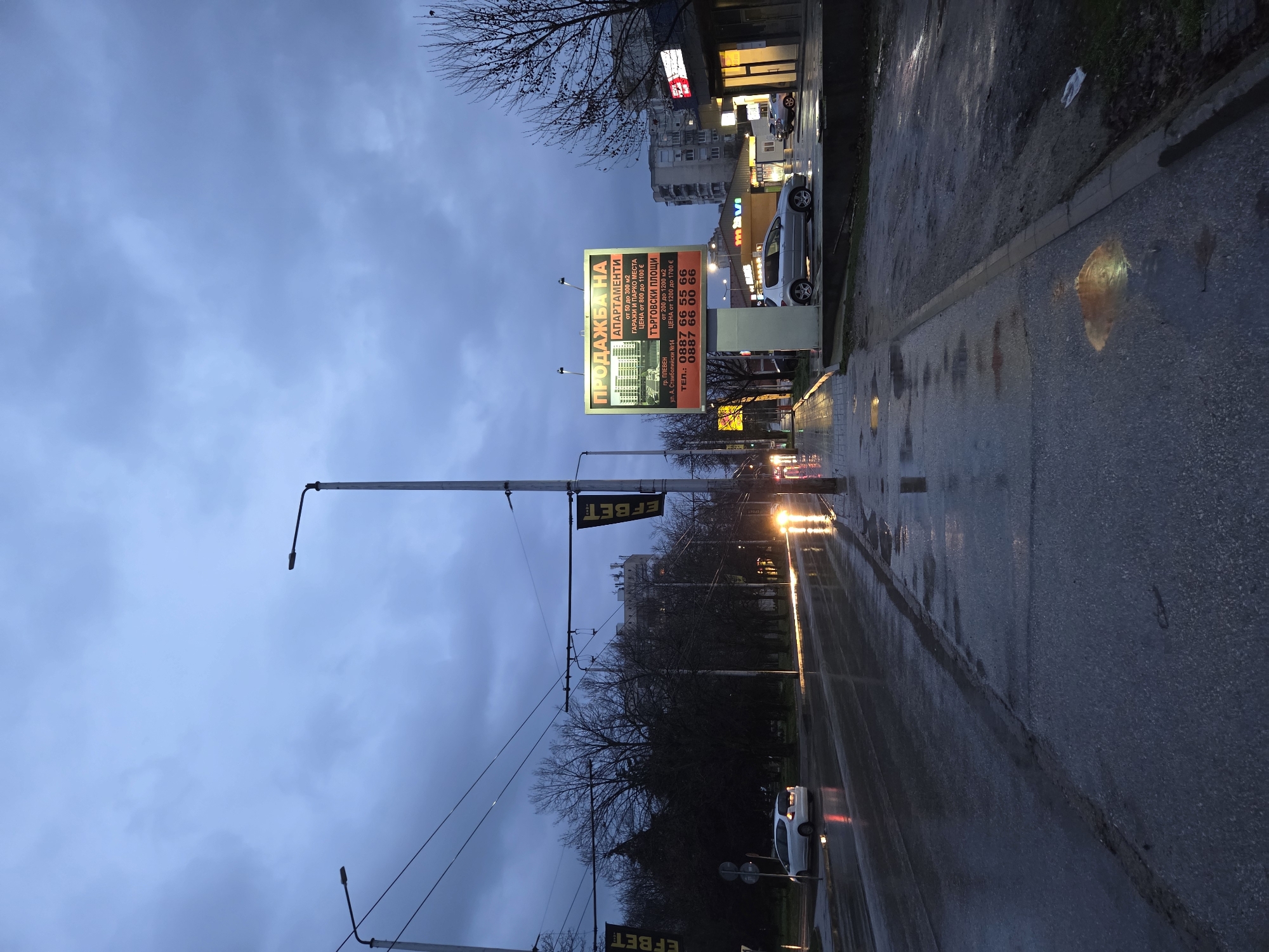 wet street in Pleven, Bulgaria on an overcast day. The street is flanked by sidewalks and lined with trees. A large billboard advertises apartments and commercial space for sale, with contact phone numbers. The address is given as ul. A. Stamboliiski №14. There are parked cars and streetlights along the street. "EFBET" is also visible on the electrical poles. The reflections of the streetlights and car headlights are visible on the wet pavement.