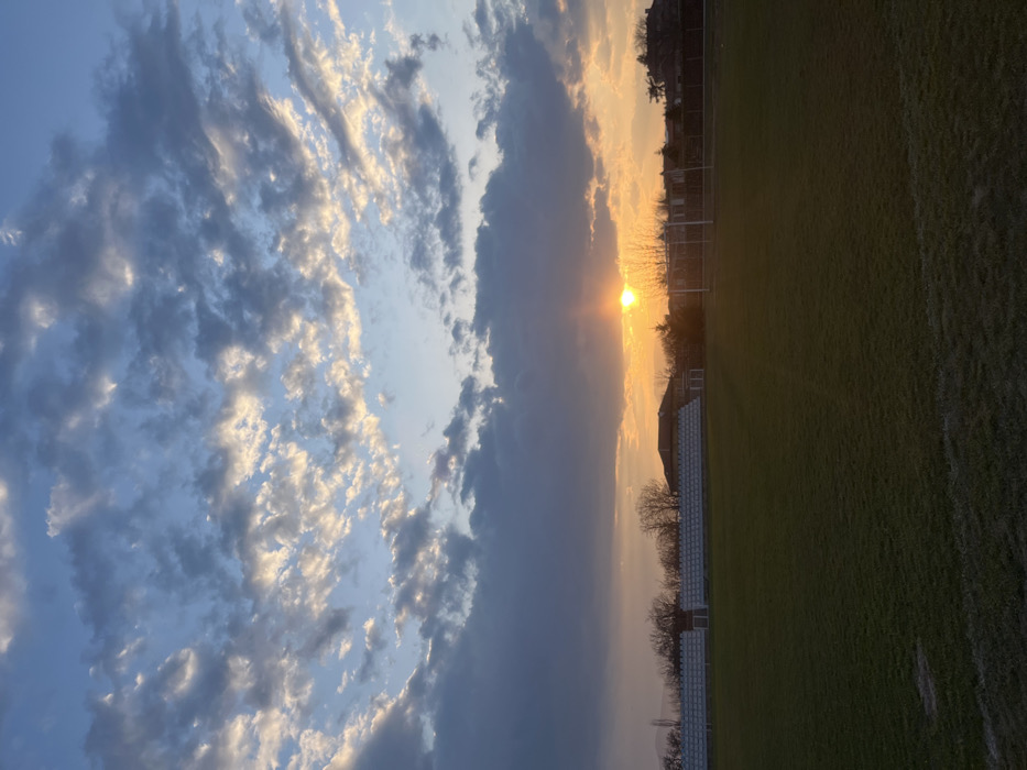 The image displays a panoramic view of a sports field, specifically a football pitch, at sunset in Karlovo, Bulgaria. The upper two-thirds of the frame are dominated by a sky featuring blue patches interspersed with numerous clouds; higher clouds exhibit golden-orange illumination from the sun, while lower clouds appear darker grey and purple. The sun, a prominent bright orange disc, is positioned low on the horizon, slightly to the right of the central vertical axis. The foreground consists of a meticulously maintained green grass field, characteristic of a playing surface, with faint white markings visible near the bottom edge. Along the horizon, a series of objects and structures are present. To the far left, indistinct dark mountains or hills are visible. Moving right, a segment of white, tiered stadium seating is empty. Further right, a white football goal frame, complete with a net, stands on the field. Several bare-branched deciduous trees are scattered along this horizon line, silhouetted against the setting sun. Behind these trees and the goal, residential-style buildings with dark roofs are partially visible, along with a dark fence line. No individuals, actions, or interactions are observable within the scene.