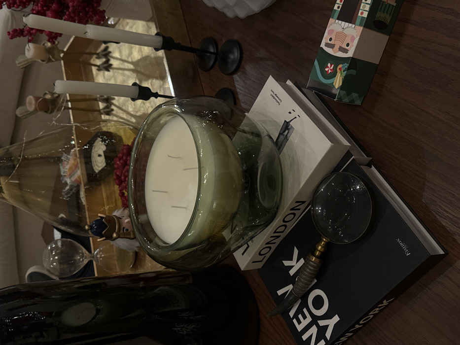 This image depicts an indoor scene in Irapuato, Mexico, showcasing a collection of decorative and functional objects arranged on a dark, polished wooden surface, likely a table or console. In the foreground, a large, unlit, four-wick candle is contained within a translucent, green-tinted glass holder with a distinct spherical base. This holder rests on a stack of two hardcover books. The top book has a white cover displaying "LONDON" prominently, with "Fashion Art" and "Gemology Store" partially visible below. The bottom book features a black cover with "NEW YORK" prominently printed and "Fashion" visible at the lower edge. A vintage-style magnifying glass, equipped with a brass and textured handle, is positioned on top of the black "NEW YORK" book. To the immediate right of the books, a small, rectangular box, decorated with a colorful nutcracker design predominantly in green, red, and beige, is partially visible. In the mid-ground and background, a golden rectangular tray holds additional items. Two black metal candle holders, each supporting an unlit, white tapered candle, are positioned on the right side of the tray; these candles exhibit evidence of prior burning. To the left of these candles, an hourglass filled with sand is visible. A small nutcracker figurine, characterized by a blue and gold crown, is situated near the hourglass. A cluster of red decorative berries also occupies a section of the tray. On the far left, a tall, dark glass bottle or vase is partially visible. Centered in the background, a large, clear glass vessel, possibly containing internal decorations or string lights, is also present on the tray. The background beyond the tray is softly blurred, indicating an interior setting with ambient lighting.