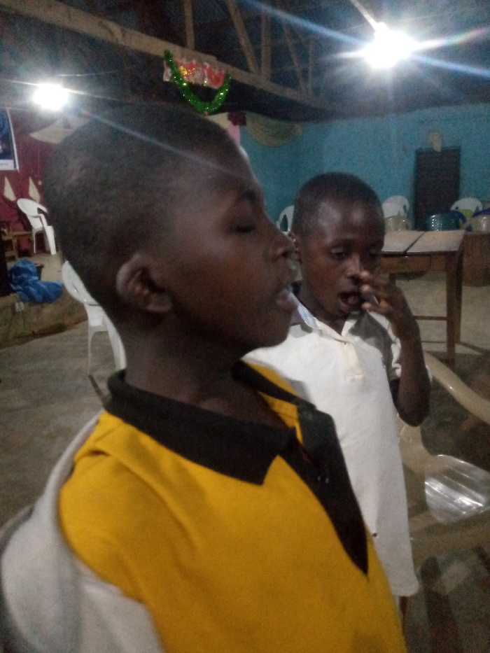 The image displays an indoor scene in a facility located in Agban, Nigeria, featuring two young males