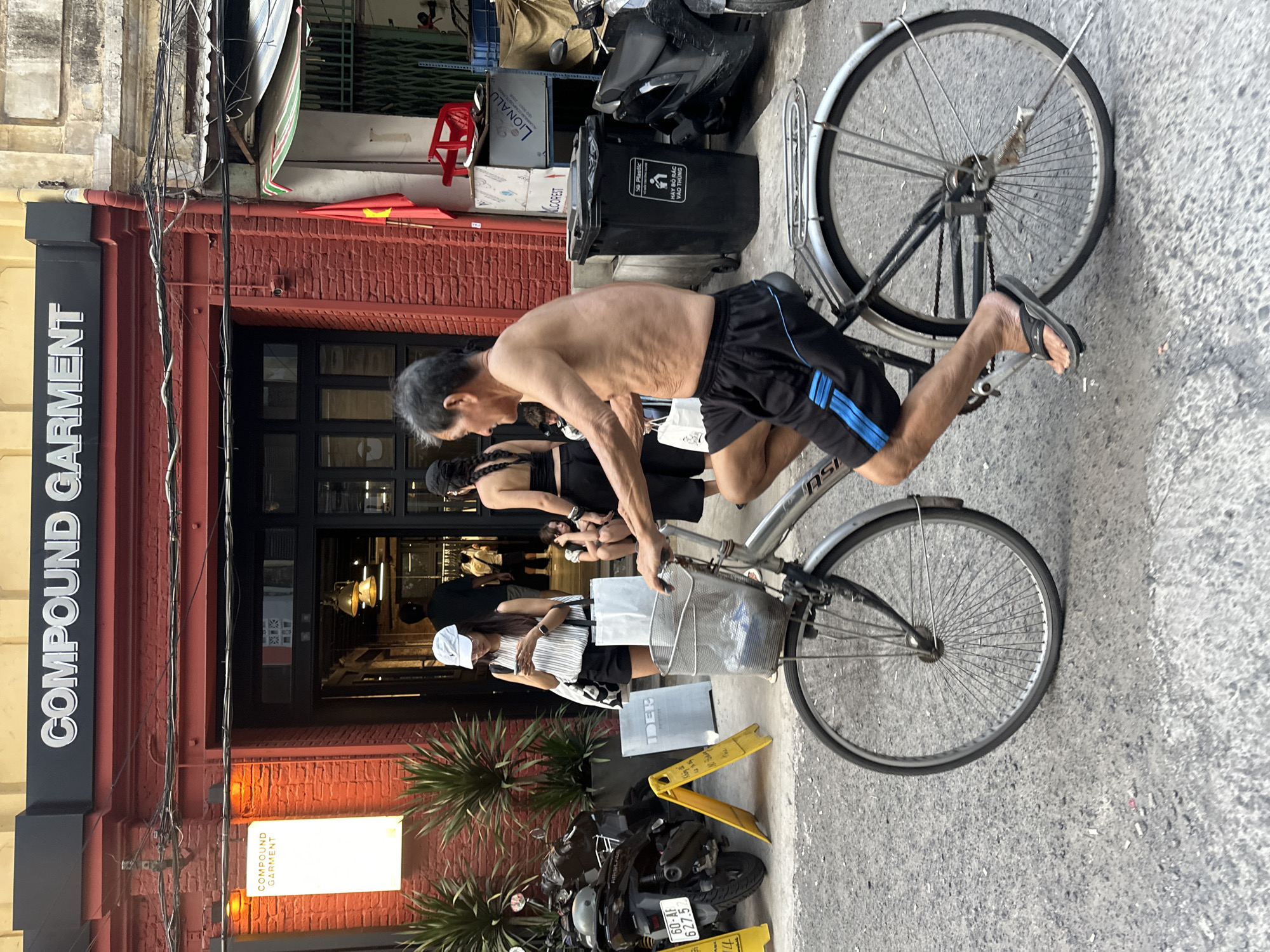 This image depicts a bustling urban street scene in what is understood to be the city of Thủ Đức, Vietnam, featuring a man cycling past a storefront. In the foreground, an elderly man, shirtless with visible aged skin and grey hair, is seen from the right side, pedaling a silver-colored bicycle across the frame towards the left. He wears black athletic shorts with blue vertical stripes and black flip-flops. The bicycle has a silver frame, a front basket containing a plastic bottle and other items, and a rear rack. The background is dominated by the brick facade of a commercial building. The primary structure is red brick, with a large, dark entrance in the center. Above the entrance, a prominent black sign with white lettering reads "COMPOUND GARMENT." To the left of the entrance, a vertical, illuminated sign also displays "COMPOUND GARMENT." On the sidewalk in front of the store, several individuals are present. A young woman with long dark hair, wearing a white baseball cap, a striped sleeveless top, black shorts, and white sneakers, stands looking down at her smartphone. She holds two white shopping bags with a grey logo (partially visible as "IDEN" or similar). To her left, two black motorbikes are parked, one identifiable as a Honda Airblade with license plate "60-AF 627.5." Two yellow, A-frame "wet floor" style signs are positioned near the motorbikes. Further into the store entrance, several indistinct figures are visible, suggesting customer activity. To the right of the entrance, another woman, wearing a black top and skirt, is partially visible from behind. A small child or person is seated on the ground near the entrance, largely obscured. Adjacent to the store's red brick wall, a Vietnamese flag with a yellow star on a red field hangs vertically. A black plastic waste bin, labeled "SỐ Plastic" and "HÃY BỎ RÁC VÀO THÙNG," stands on the sidewalk. Overhead, a dense tangle of electrical and communication wires spans across the upper portion of the frame. The street surface is a textured, light grey asphalt. The lighting suggests daytime conditions.