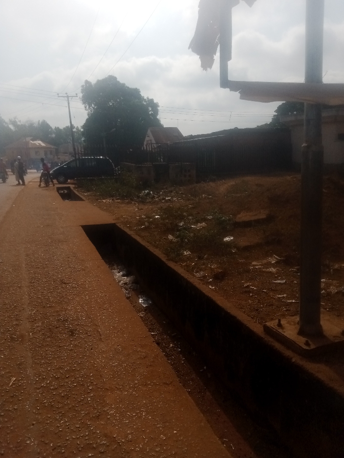 The scene depicts a roadside environment in Ankpa, Nigeria, under an overcast sky. In the foreground, an unpaved, reddish-brown dirt road surface is visible, extending towards the midground. Parallel to the road on its right, an open concrete drainage ditch contains stagnant water and various debris. Adjacent to the ditch, a patch of uneven, reddish-brown ground is heavily littered with plastic bags and other refuse. A metal structure, identified as a damaged billboard support pole with torn fabric remnants, stands in the far right foreground. In the midground, on the left side of the road, several individuals are present, standing or walking. A dark-colored car is parked or stopped nearby, and a person is positioned on a motorcycle. Utility poles with overhead wires extend along the left side of the road. The background reveals a series of buildings with diverse architectural styles, including structures with reddish-brown tiled roofs and others with darker, possibly corrugated metal roofs. These buildings are partially obscured by dense green foliage from prominent trees.