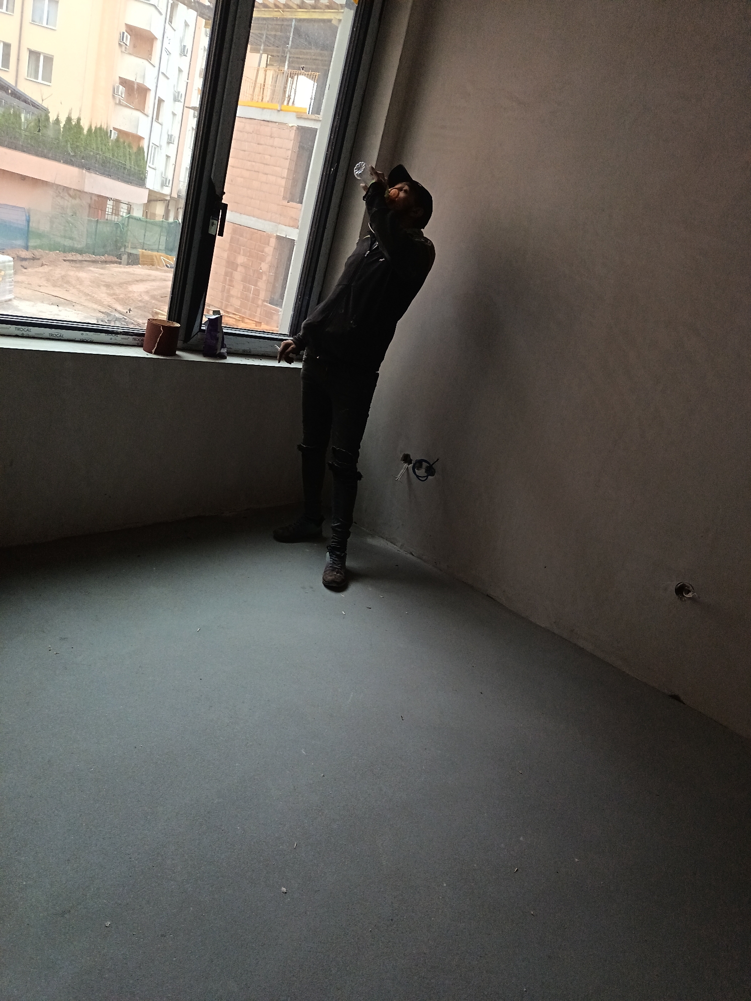 The scene is an interior room under construction or renovation, located in Sofia, Bulgaria. The room features unfinished, light grey plastered walls and a dark grey screed floor. A large, dark-framed window, branded "TROCAL" on its lower frame, occupies the left side of the image, serving as the primary light source. One male individual is present, positioned near the window sill. He is dressed in a black cap, dark jacket, dark ripped jeans, and dark boots. The subject is observed with his head tilted back, drinking from a clear plastic bottle held in his right hand. His left hand holds a lit cigarette, with a visible wisp of smoke. On the concrete window sill, a reddish-brown cylindrical object, possibly a roll of abrasive material or tape, and a purple rectangular container are present. Two circular cutouts for electrical installations, one with exposed wiring, are visible on the right wall. The exterior view through the window reveals a construction site in the immediate foreground with exposed earth and a green mesh barrier. A partially constructed brick building is visible beyond this, featuring yellow scaffolding or protective railings on its upper levels. In the background, established multi-story residential buildings with light-colored facades, numerous external air conditioning units, and a row of green hedge-like vegetation are present.