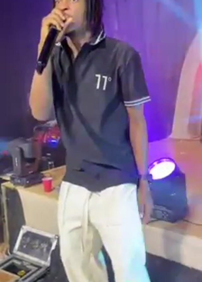 A young Black man is singing into a microphone on a stage. He is wearing a black baseball cap, a black polo shirt with the number 77 and white trim, and loose white pants. He has dreadlocks. The stage has lighting equipment and a red plastic cup on a table. In the background is a white architectural feature with an arch shape. The stage is decorated with lights that are green, blue, and red. The video is shot from a low angle.