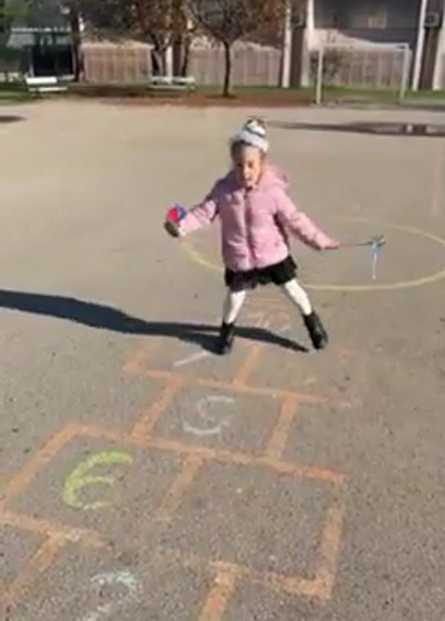 A young girl with brown hair in a bun and wearing a pink puffy jacket, black skirt, white tights, and black boots is playing hopscotch on a gray paved surface. She’s holding a colorful toy in one hand and a silver pinwheel in the other. The hopscotch squares are drawn in orange with numbers in the boxes. The girl hops through the squares. The setting appears to be an outdoor schoolyard or park with trees, buildings, and a bench visible in the background.