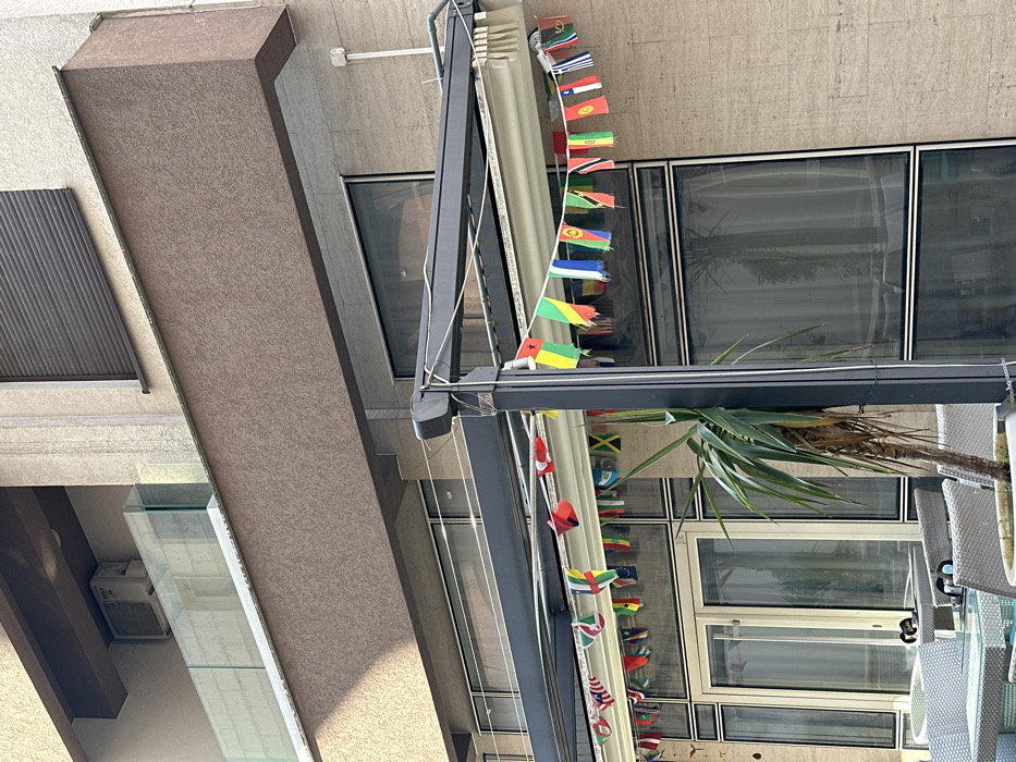 This image depicts an outdoor patio setting in Budva, Montenegro, adjacent to a multi-story building. The building features a light beige textured facade. An upper floor displays a brown roll-down shutter, a cantilevered balcony with a clear glass railing, and an external air conditioning unit mounted above the railing. The lower level of the building presents a facade of light-toned rectangular tiles and large, dark-framed glass windows and double doors reflecting the surroundings. The patio area is covered by a dark grey, retractable pergola structure. Suspended from this pergola are multiple strings of small international flags, exhibiting a diverse array of national colors and designs; several flags show signs of fraying and wear. Partially visible in the lower left are light-colored, possibly rattan or wicker, outdoor chairs positioned around glass-topped tables. A slender, palm-like plant in a pot stands near one of the pergola's support posts. White electrical wiring is visible along the pergola's framework. No individuals are present in the scene.