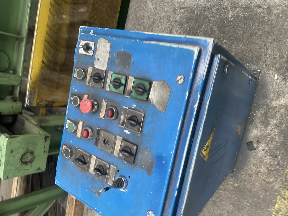 A blue, heavily worn industrial control panel, approximately knee-high, is prominently featured in an industrial setting