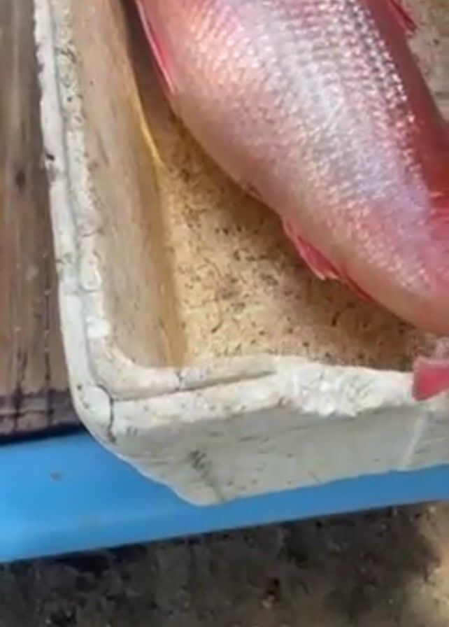 close-up view of a red fish lying in a rectangular, white container. The fish is positioned diagonally within the container, with its tail end closer to the viewer. The fish has red fins and scales that shimmer slightly. The camera moves closer to the head of the fish, revealing its open mouth and dark eye. The container appears to be made of a coarse material. The container is situated on a surface with a blue pipe. Some bamboo can be seen in the background.