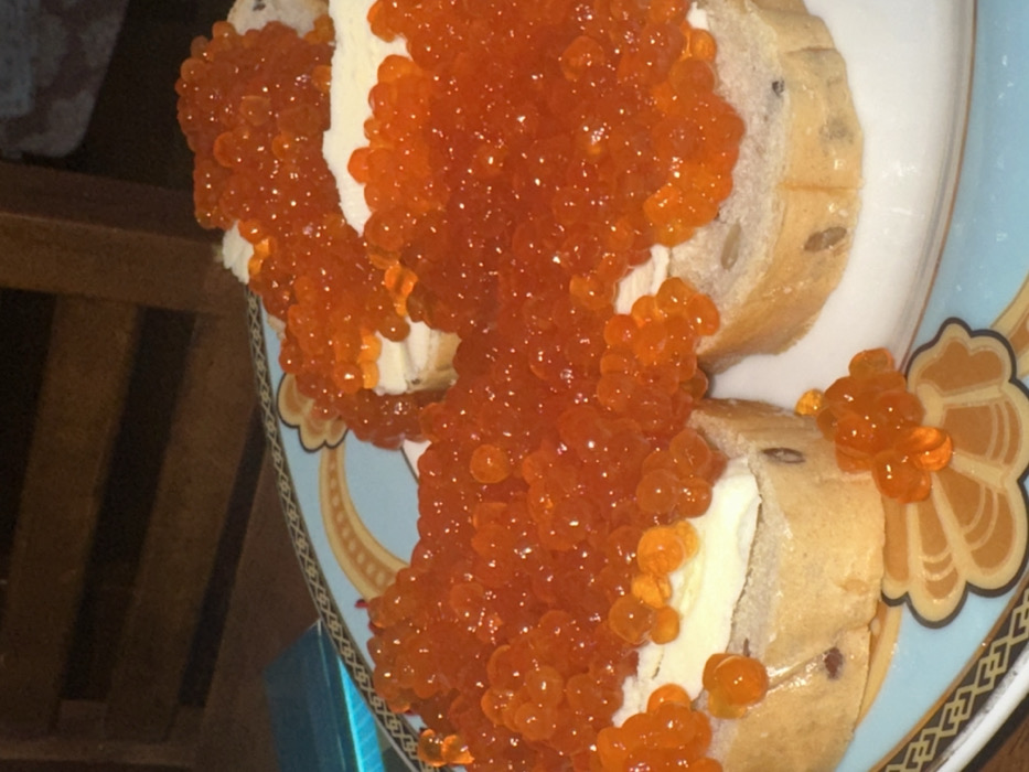 - "Two slices of bread on a decorative plate are generously topped with butter and bright orange caviar" by FM-OecyI3, licensed under CC BY 4.0