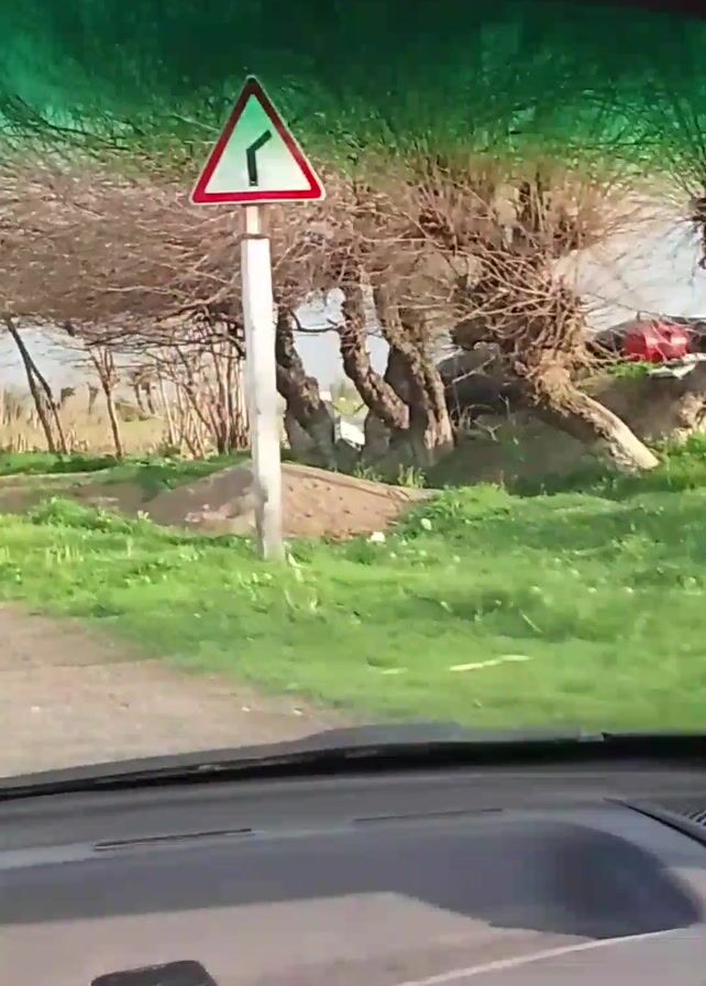 view from inside a car driving on a dirt road past a field with trees. The trees are mostly bare, with some green grass and weeds growing around them. There is also a traffic sign visible. The car is moving slowly, and the driver's dashboard is visible. The windshield has a green sun visor.