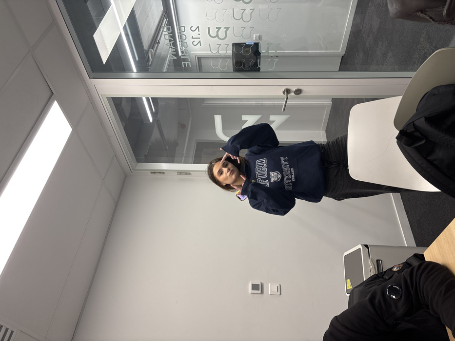 The scene depicts an interior view of a modern office space, identified as the RobbLe agency in Paris, France. A young woman with brown hair stands centrally, facing the camera. She wears a dark blue hooded sweatshirt featuring "OXFORD UNIVERSITY ENGLAND" text, and dark trousers. Her hands are raised, forming a peace sign gesture with both palms facing outward, and a mobile phone is partially visible in her left hoodie pocket. She exhibits a slight pout. To the woman's left, a plain white wall displays two square white electrical fixtures. To her right, a glass partition functions as a wall or door, featuring a silver door handle. Reversed text, including "BRAND ROBBLE" and repeating stylized "m" or wave graphics, is visible on the glass, indicating it is etched or applied on the exterior side of the partition. The ceiling is constructed with modular white tiles and recessed rectangular fluorescent light fixtures. The floor is covered with dark carpeting. In the immediate foreground, a white chair is partially visible, with a black backpack draped over its backrest. To the far left, a person's upper torso and left arm are visible, seated at a light-colored wooden desk. This individual wears a black long-sleeved garment with a circular patch on the left arm. A white rectangular waste bin with a black lid stands beside the desk.