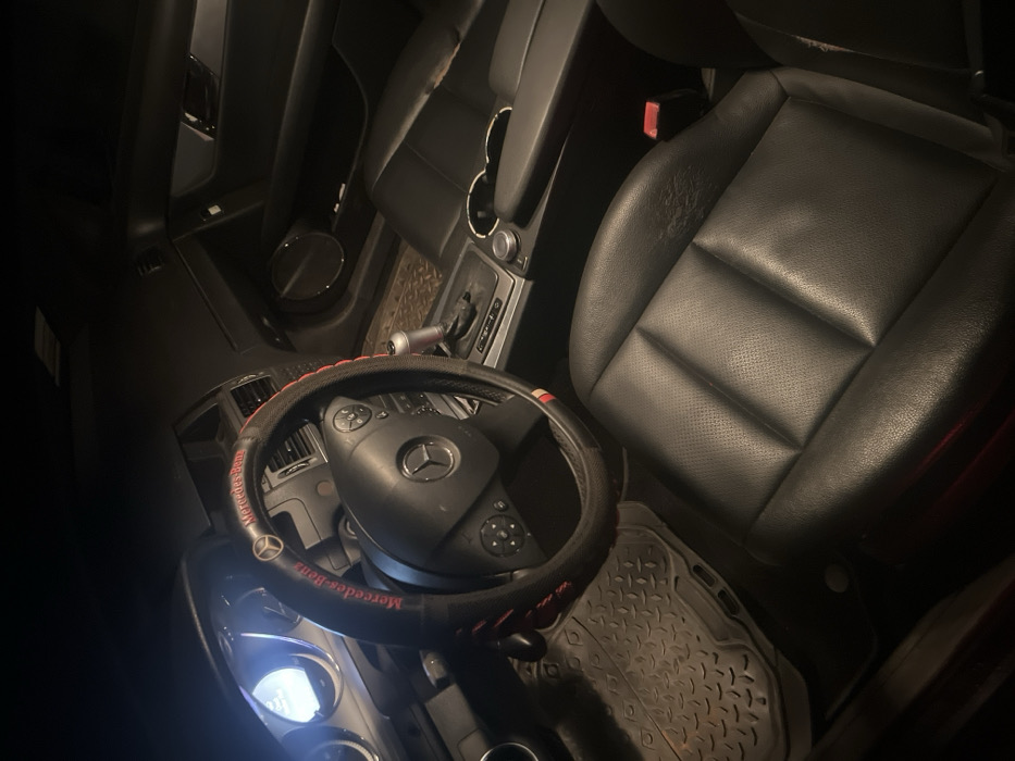 The image showcases the interior of a car, focusing on the driver's side. A black leather seat with visible wear is prominent. The steering wheel features a Mercedes-Benz branded cover. The gear shift and center console are also visible. A floor mat lies near the pedals. Overall, the interior appears dark, and the lighting is uneven.