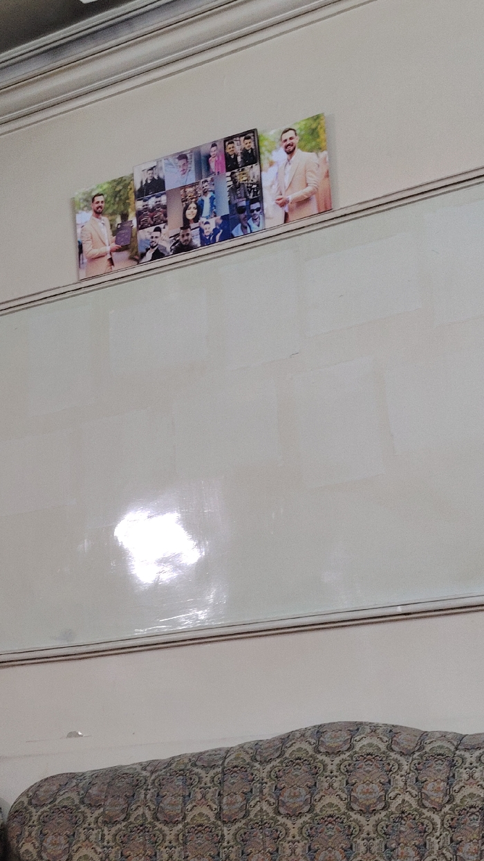 The image depicts an indoor scene within Al-Qaboun Municipality, Syria, focused primarily on a wall and a piece of furniture. In the upper section, a white wall is visible, featuring a horizontal decorative trim line below the ceiling. Mounted on this wall are three photographic displays. The left display shows a smiling male individual with a beard, dressed in a light-colored suit, holding a dark object, with green foliage visible in the background. The central display is a rectangular collage composed of multiple smaller photographs, appearing to feature the same male individual from the standalone photos, along with other individuals, including women. The right display again features the same male individual in the light-colored suit, smiling and posing. Below the photographic displays, the wall transitions to a large, light-colored, reflective surface, possibly a mirror or a highly polished panel. This surface exhibits a prominent bright reflection in its lower-left quadrant, indicating an unseen light source. Faint horizontal lines are discernible across this reflective surface, along with subtle rectangular indentations or marks. The lower portion of the image reveals the upper edge of an upholstered furniture piece, likely a sofa. The fabric displays an intricate, multi-colored pattern consisting of ornate motifs in shades of brown, beige, blue, and green. The top edge of this furniture piece is gently curved. No human figures are actively present in the immediate foreground, and no specific actions or interactions are depicted beyond the static display of photographs and the environmental elements.