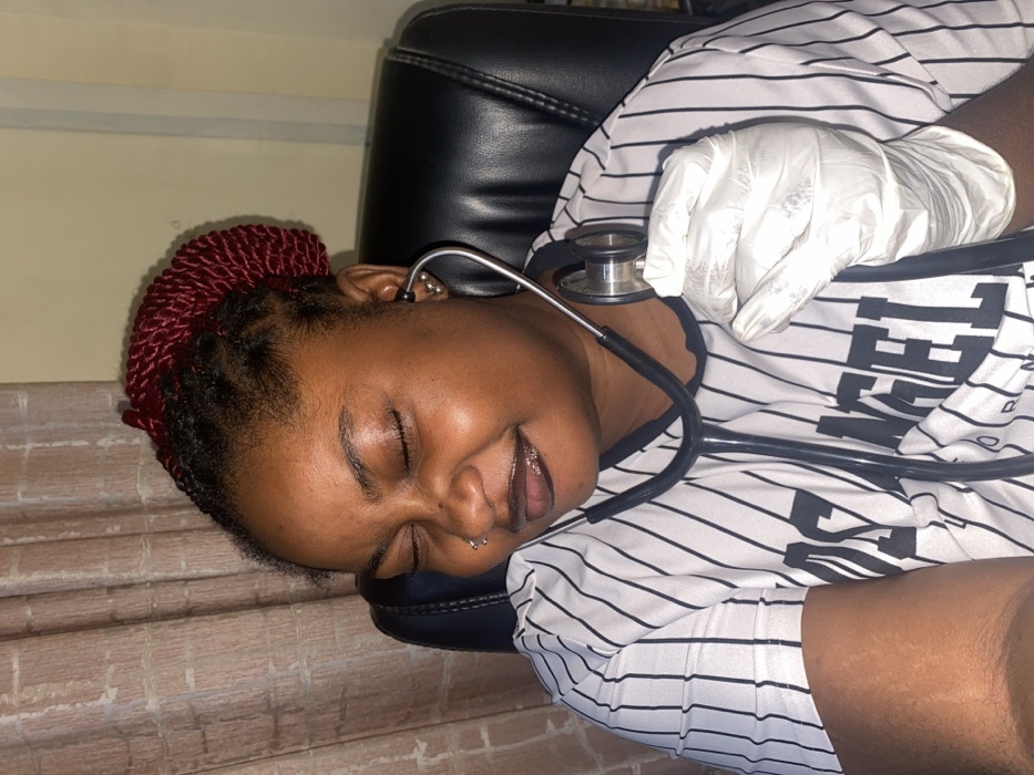 An individual, a woman of African descent, is depicted seated indoors in Tudun Nupawa, Nigeria. Her eyes are closed, and she exhibits a subtle smile. Her dark, braided hair is partially covered by a red braided wrap. She wears a white short-sleeved shirt with thin black vertical stripes and partial lettering that reads "LOS ANGELES" on the front. A white disposable glove covers her right hand. A black stethoscope is draped around her neck, with its earpieces inserted into her ears. Her gloved right hand holds the stethoscope's chest piece. The background consists of light brown curtains with a vertical pattern on the left and a plain light-colored wall on the right. A dark-colored office chair back is visible behind her.