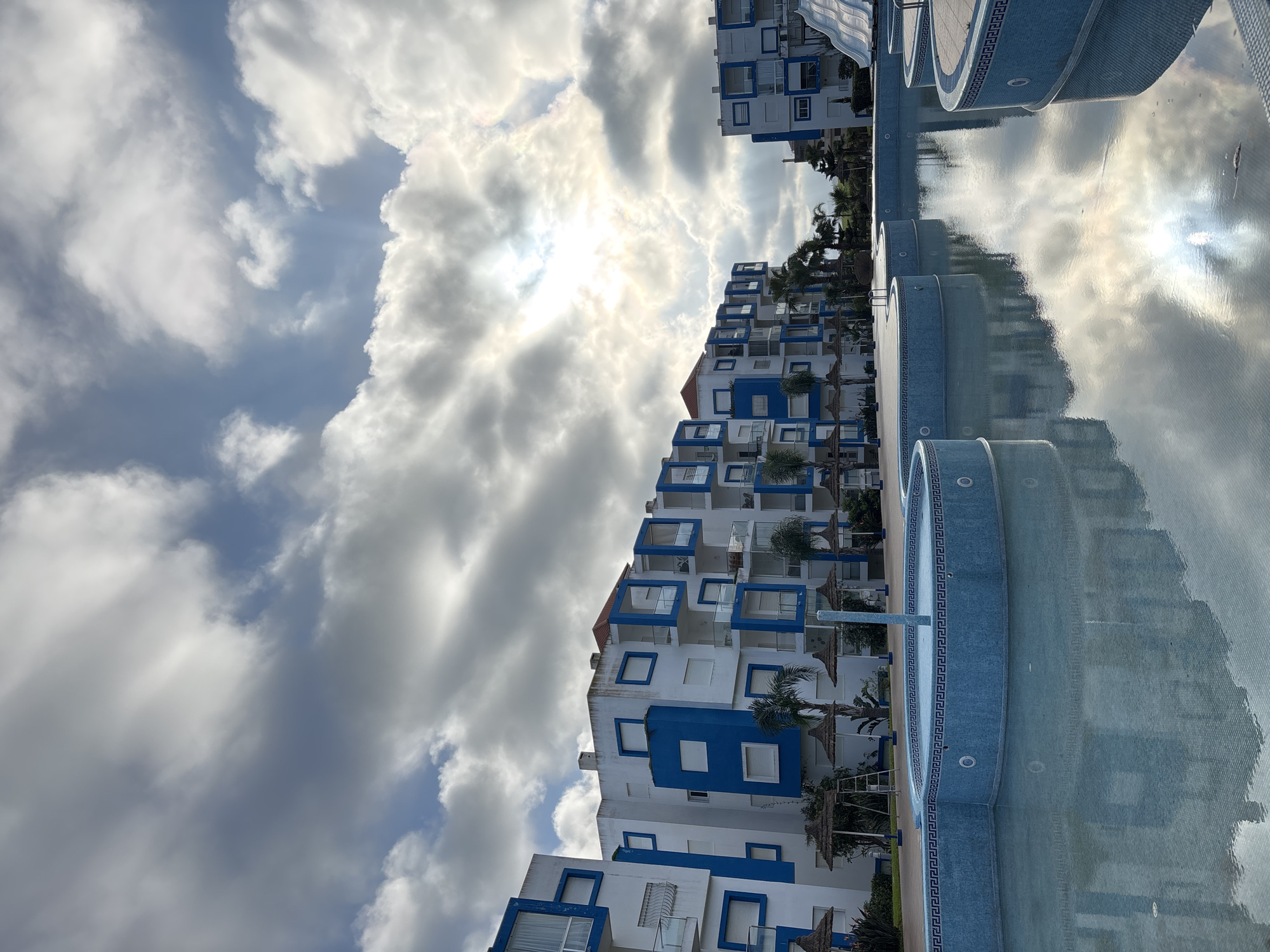 The image depicts an exterior scene in M'Diq, Morocco, focusing on a swimming pool area bordered by multi-story buildings under a partially cloudy sky. The foreground features a multi-sectional swimming pool complex, tiled in light blue mosaic with a dark blue and white Greek key pattern at the waterline. The pool contains a low water level, reflecting the sky and architectural elements. Several buildings, predominantly white with significant blue accents on balconies, window frames, and wall sections, rise behind the pool. Palm trees and other green vegetation are interspersed throughout the complex. Multiple straw-thatched sun umbrellas are arranged around the pool's edge, and a white water slide is visible on the right side of the image. No individuals are present in the scene. The sky shows scattered white and gray clouds, with the sun appearing brightly through a break in the upper right quadrant, casting significant light and reflections on the water's surface.