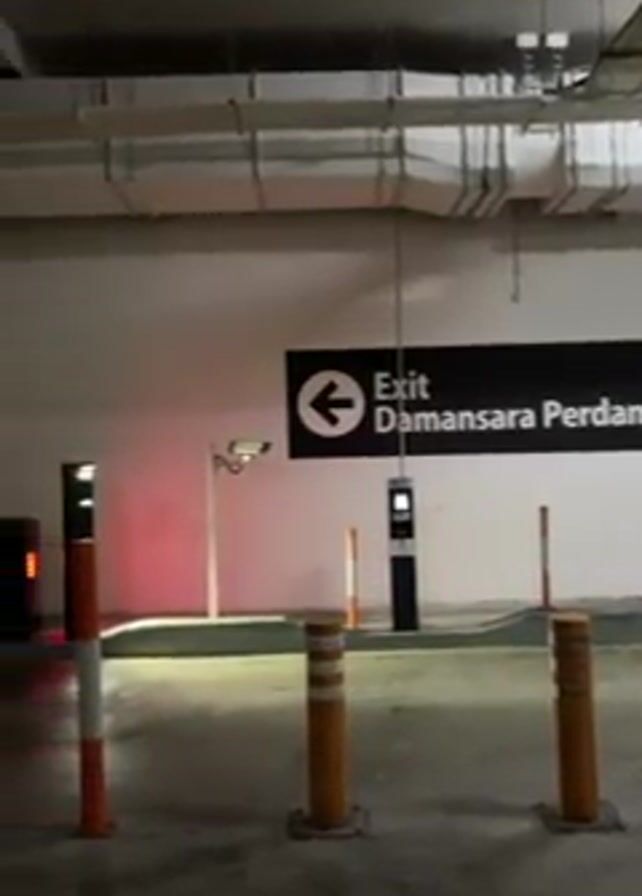 interior of a parking garage. Initially, the camera faces a sign reading "Exit Damansara Perdana" with an arrow pointing left. The area is lit by overhead fluorescent lights, and the garage has a concrete floor with multiple expansion joints. There's a parking gate arm and an access control kiosk nearby. The camera then slowly pans to the left, revealing a ramp leading to the outside. Yellow arrows are painted on the ramp to guide traffic. Outside, a road with parked cars can be seen.