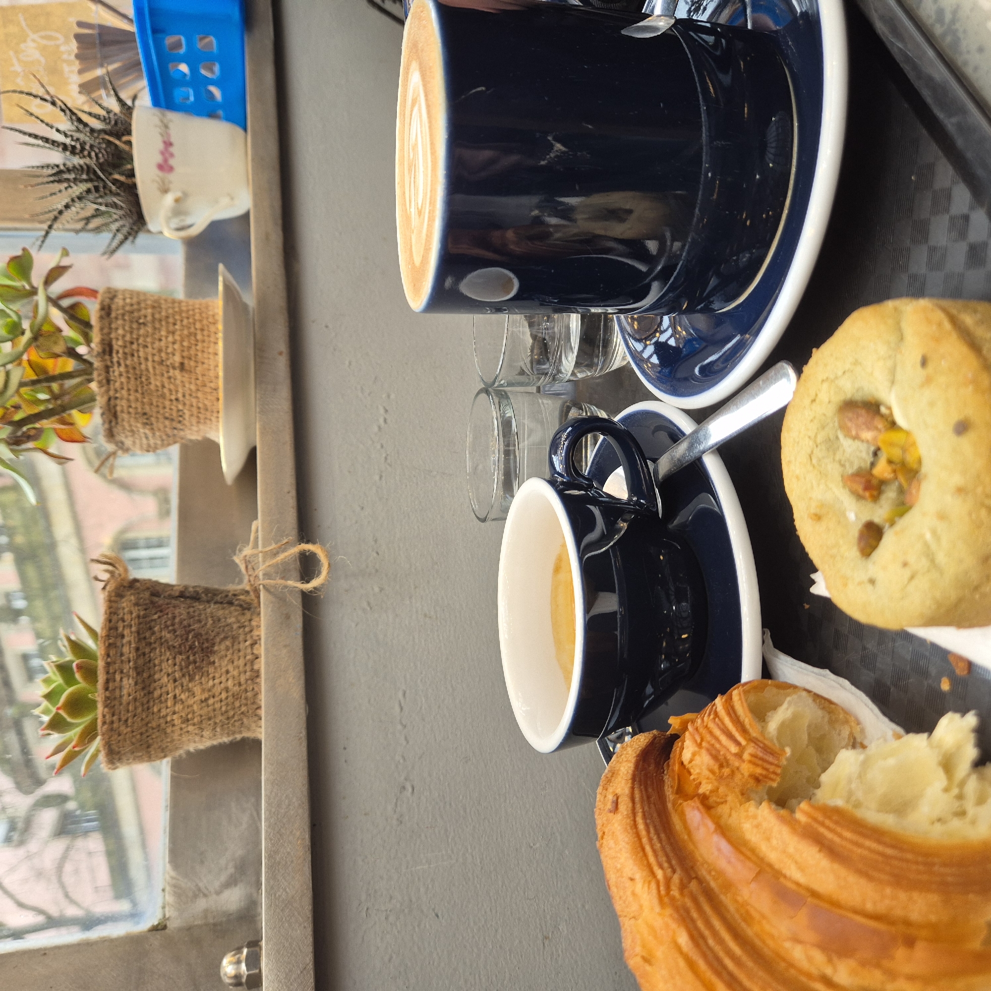 The image displays an indoor setting, likely a cafe or restaurant, with a focus on food and beverages placed on a dark, checkered tray in the foreground. On the tray, from left to right: - A golden-brown croissant, partially broken open to reveal its flaky interior, rests on a white paper napkin. - A dark blue ceramic cup, containing a light brown liquid, is positioned on a matching saucer with a silver spoon. - Two small, clear glasses, each partially filled with water, are situated between the two coffee vessels. - A larger dark blue ceramic mug, containing a beverage topped with foam exhibiting a rosetta-style latte art pattern, rests on a matching saucer. Reflections of the surrounding environment are visible on the mug's glossy surface. - Partially visible in the lower center is a round, light-colored pastry with a central indentation containing fragmented nuts. Behind the tray is a solid grey wall. Above the wall, a window ledge extends across the frame. On this ledge, from left to right, are three potted plants: - A succulent with green and red-tipped leaves, contained in a burlap-wrapped pot. - Another succulent with green and reddish-orange leaves, also in a burlap-wrapped pot on a white ceramic saucer, with a piece of twine hanging from it. - A spiky succulent (Haworthia) planted in a white teacup adorned with a faint pink floral design. A small, metallic, dome-shaped object is located on the far left of the window ledge. To the right, a blue plastic slotted basket is partially visible, obscuring a blurred yellow sign with white text. Through the window, an outdoor urban scene is discernible, characterized by blurred architectural structures with a pinkish facade, segments of bare tree branches, and an overcast sky. This architectural style is consistent with buildings found in European cities, including Strasbourg, France. No specific landmarks are visible to pinpoint an exact location within Strasbourg. No individuals are present in the image. The broken croissant indicates recent consumption. The items are arranged as if for a meal or coffee break for at least two individuals.