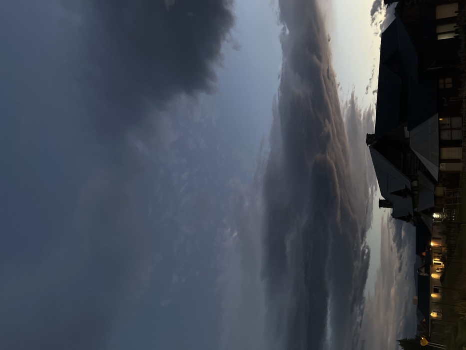 An outdoor scene depicts a turbulent sky dominated by dark, ominous clouds. The lighting suggests dusk or dawn. A row of houses is visible along the right side of the image, their dark roofs contrasting sharply with the sky. Illuminated windows indicate activity within. The overall impression is of an impending storm. The image is oriented vertically.