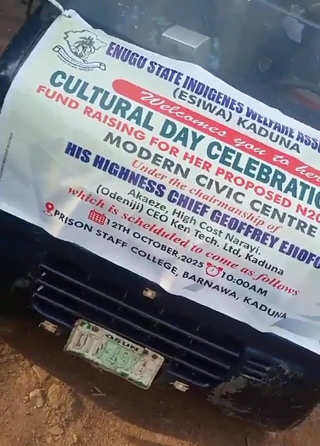 A stationary video shows the front of a dark colored car with a large banner attached to it. The banner advertises a cultural day celebration and fundraiser for a proposed modern civic center. The event is organized by the Enugu State Indigenes Welfare Association in Kaduna and will be under the chairmanship of His Highness Chief Geoffrey Ejiofor. The banner states the event will take place on October 12, 2025, at Prison Staff College, Barnawa, Kaduna. A man's hands appear and hold up a bottle of what looks like whiskey, briefly obscuring parts of the banner. The car is parked on a dirt or sandy surface. Other people are visible in the background.
