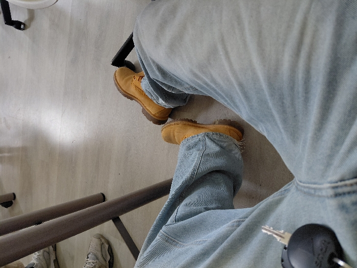 The image presents an indoor scene captured from a first-person perspective, looking downward. The primary subject is the lower torso and legs of an individual wearing light blue denim jeans. A single silver-colored key attached to a black, circular fob rests on the left thigh of the jeans. The individual is wearing tan or wheat-colored lace-up boots, with both feet visible and extended forward. To the upper left of the frame, the lower legs and feet of a second individual are partially visible, wearing light-colored athletic shoes. The flooring is a light, neutral-toned material, possibly laminate or linoleum, showing subtle variations in color and texture. Several metallic grey cylindrical table or chair legs are present, along with the black wheel and base of what appears to be an office chair on the right side of the frame. The specific location within Tsarevo, Bulgaria, is not discernible from the visual information provided in the image.