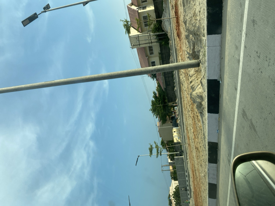The scene depicts a daytime view of a developing urban or suburban area in Alaguntan, Nigeria, observed from a vehicle. In the foreground, the upper portion of a vehicle's left side mirror is visible. A multi-lane asphalt road with a solid white lane marking occupies the bottom. Immediately adjacent to the road is a concrete curb painted with alternating black and white segments, bordering a wide, sandy median strip. This median contains several mounds of reddish-brown earth, indicating recent landscaping or construction activity. Multiple tall, grey utility poles equipped with modern, rectangular LED streetlights are positioned along the median and in the background. A prominent pole stands centrally, extending into the sky. Newly planted saplings are spaced along the median. Behind the initial sandy expanse, a low concrete barrier or wall separates the median from properties beyond. In the mid-distance, several individuals are present. One figure in a light-colored top walks towards the left along a paved or cleared area behind the barrier. Further right, two other individuals are discernible standing near what appears to be a dark vehicle or construction material. Their specific actions are indeterminate. The background features several residential structures with light-colored facades and reddish-brown tiled roofs, interspersed with green trees and shrubbery. Overhead utility lines are visible extending between poles behind the buildings. The sky is bright blue with scattered, wispy white clouds.