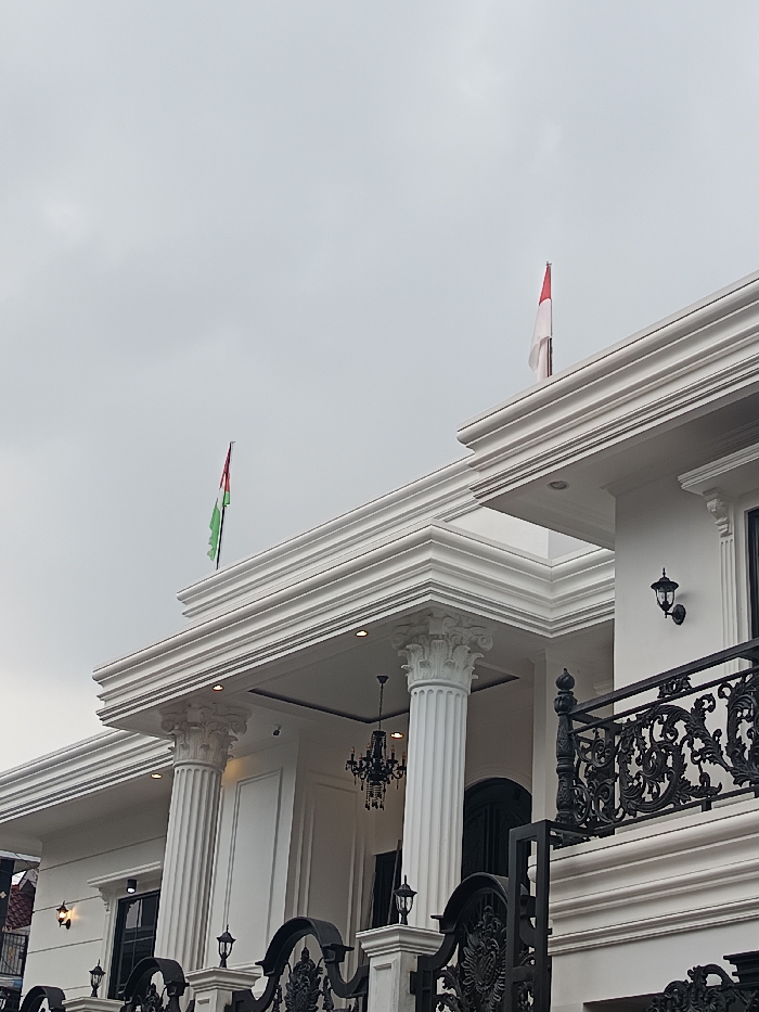 The image presents a low-angle, exterior view of a large, neoclassical-style building in Sindangasih, Indonesia, beneath an overcast sky. The structure is predominantly white, featuring multiple fluted columns with ornate Corinthian capitals supporting an expansive, multi-tiered cornice. Two flags are prominently displayed from the roofline: a flag with vertical stripes of red, white, and green is visible on the left, and a flag with horizontal stripes of red over white is on the right. An ornate black wrought-iron railing, indicative of a balcony or terrace, is visible on the upper right portion of the building. Exterior lighting includes several black, antique-style wall-mounted lanterns and recessed downlights embedded in the ceiling overhangs. A black chandelier with multiple arms hangs within a portico, and a small security camera is mounted discreetly near one of the columns. Dark-framed windows or doors are partially visible. No individuals or discernible activities are present in the scene.